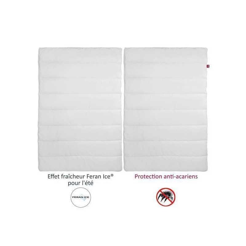 Couette 4 SAISONS Anti-Acariens 140x200cm – 1 couette légere (200g/m ) idéale pour l’été + 1 couette tempérée (300g/m ) idéale en mi-saison – Enveloppe : 100% Polyester FERAN ICE® pour la couette légere et 100% Polyester ACARISTOP® pour la couette tempérée – Piquage : ligne – Fabrication Française.