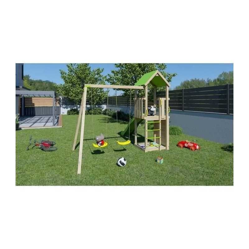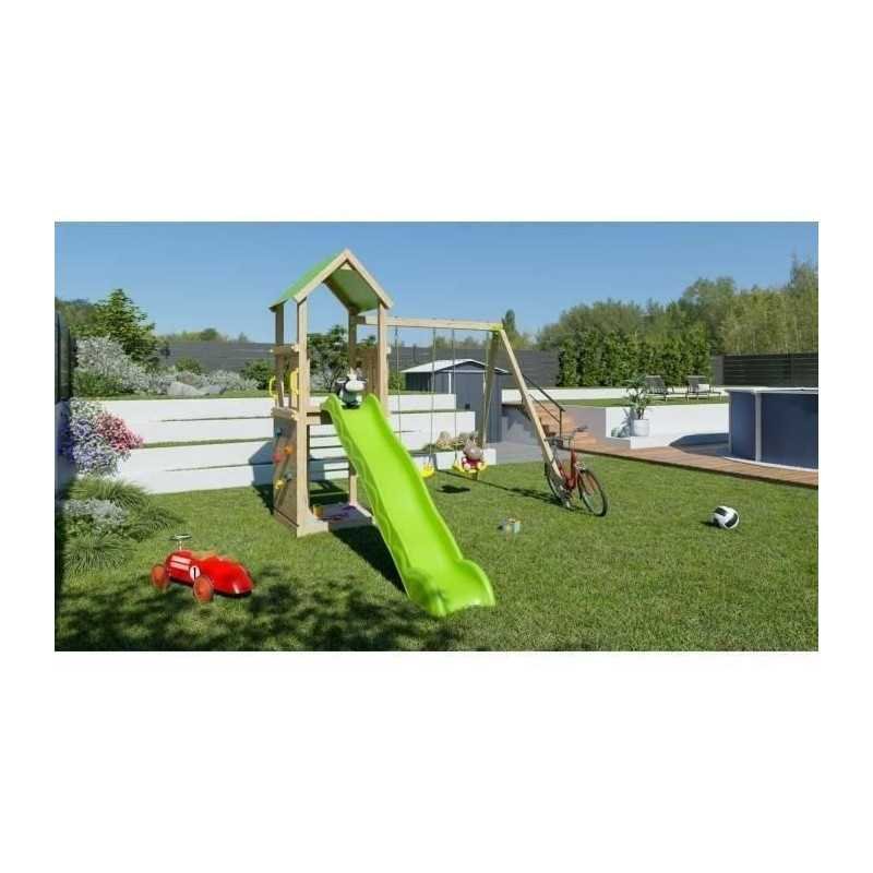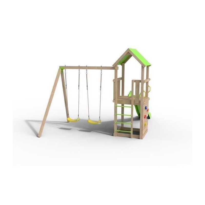 Offrez a vos enfants une aire de jeux en bois SMART XPERIENCE de TRIGANO pour s’amuser en toute sécurité. Cette station de jeux en bois peut accueillir jusqu’a 7 enfants et comprend deux balançoires, un bac a sable, un mur de grimpe et une plateforme avec toboggan de 2,63m.